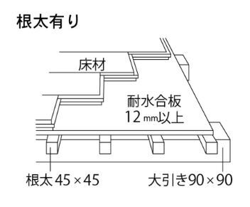 - If there is a lot of moisture under the floorboards, install a moisture-proof sheet that is 0.1 mm or more thick between the floor joists and the disposable plywood, or caulk and tape the joints to prevent moisture from getting in from under the floorboards.