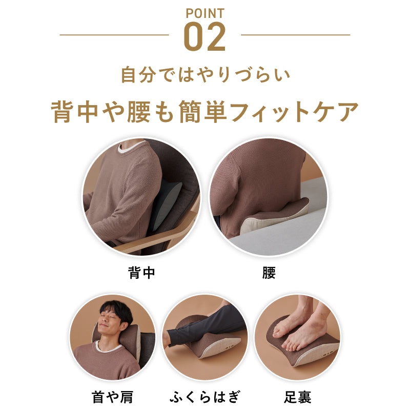 The protruding massage balls of approximately 65mm firmly stimulate stiff muscles. The "Strong * Massage™" improves blood circulation for muscle stiffness accumulated in the shoulders and heavy lower back fatigue.