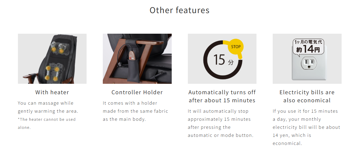 • Up and down movement speedNeck/shoulders: approx. 0.9cm/sec Back/lumbar area: approx. 1.0cm/sec